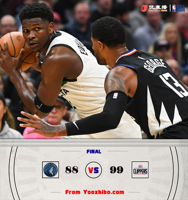 24直播网12月15日讯 NBA常规赛继续进行,快船主场迎战森林狼,快船最近迎来小卡的状态复苏,目前已经2连胜排在西部第6位,而森林狼则是一直不在状态,目前2连败排名西部第11。双方比赛上来就陷入疯狂打铁战,外线也一塌糊涂,快船主力们都手感冰凉更是离谱,半场才得到38分,诺威尔成为奇兵帮助森林狼在半场结束时稍稍取得领先。下半场,快船众将终于回暖,肯纳德接连扔进三分反超比分,而森林狼只有爱德华兹在苦苦支撑,随后小卡和乔治也在攻防两端发力帮助快船领先到双位数,森林狼回天乏术,最终快船99-88力克森林狼,拿到3连胜的同时送对手3连败。