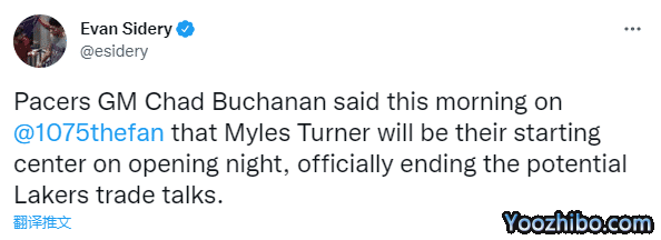 来源:24直播网09-22 10:2424直播网09月22日迈尔斯-特纳已经确定留守步行者,据NBA记者Evan Sidery报道,步行者总经理Chad Buchanan在节目中表示,特纳将在新赛季揭幕战继续担任球队的首发中锋,正式结束与湖人之间的潜在交易谈判。