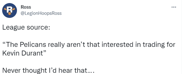10、据美媒Legion Hoops报道,鹈鹕真的没有兴趣去交易得到杜兰特;此前薪资专家Bobby Marks曾列出疯狂的交易方案,建议鹈鹕送走英格拉姆等球员和多个首轮签去换杜兰特。