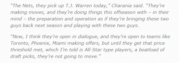 shams还表示:我认为他们在交易对话中是开放的,他们愿意接受猛龙、太阳、热火等球队的报价,但在他们的价格达到门槛之前,他们不会进行交易。我被告知(篮网对杜兰特的要价)是全明星类型的球员和一船的选秀权。