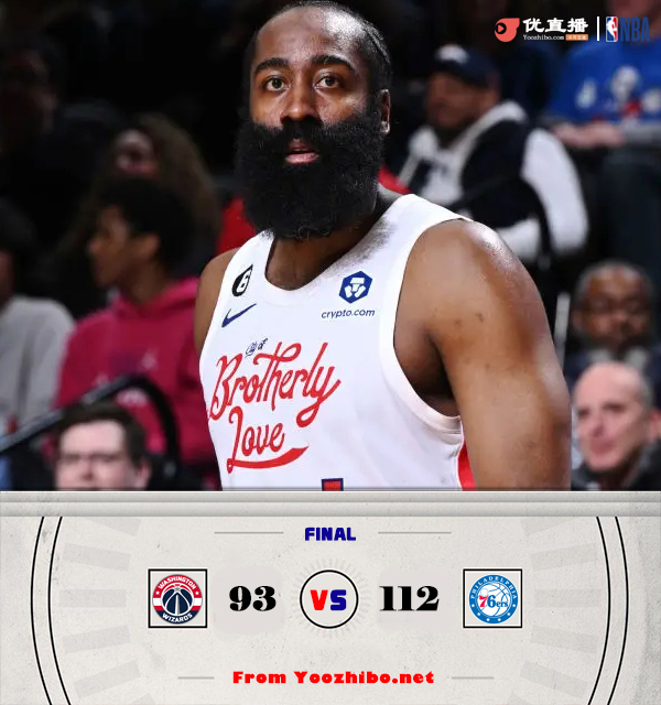 24直播网3月13日讯 NBA常规赛继续进行,76人主场迎战奇才,76人最近凭借登帝的出色发挥接连逆转对手,已经取得4连胜,目前44胜22负排在东部第3位,而奇才则是31胜36负排在东部第11位。比赛上来,哈登继续串联起球队,恩比德也延续自己的良好状态,首节10中5轰下14分帮助76人直接建立领先,而奇才主力得分点手感冰凉,好在基斯珀特成为奇兵,半场砍下14分帮助奇才追近分差。下半场,哈登三节没打完助攻已经上双,恩比德罚球线附近的中投无解,76人逐渐拉开至双位数分差,随后哈登带领替补越打越好直接拉开20分以上的分差,奇才无力回天,最终76人112-93轻取奇才,喜迎5连胜的同时送对手3连败。