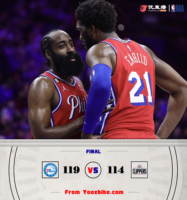 76人(19-12):哈登20分11板21助攻,恩比德44分7板3助2帽,哈里斯14分6板8助,梅尔顿13分3板3助3断,尼昂11分4板,米尔顿13分。