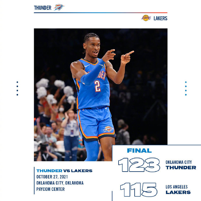 雷霆(1-4):亚历山大27分9板5助、贝兹利20分6板2助4断、基迪18分10助、多特17分6板、费沃斯15分6板、罗比13分2板、威廉姆斯5分4板、杰罗姆3分2板