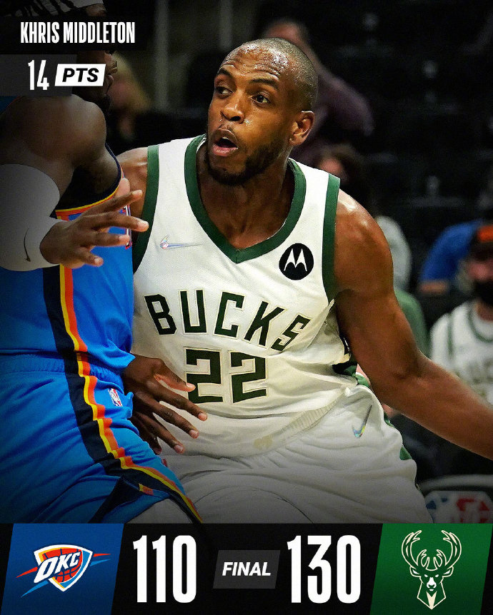 雄鹿:米德尔顿14分3篮板,字母哥8分9篮板6助攻,大洛11分4篮板,格雷森-阿伦13分4篮板,霍勒迪11分4篮板4助攻,沃拉15分8篮板3助攻,马穆克拉什维利7分,康诺顿12分3篮板3助攻,沃特斯11分,字母哥哥4分5篮板5助攻