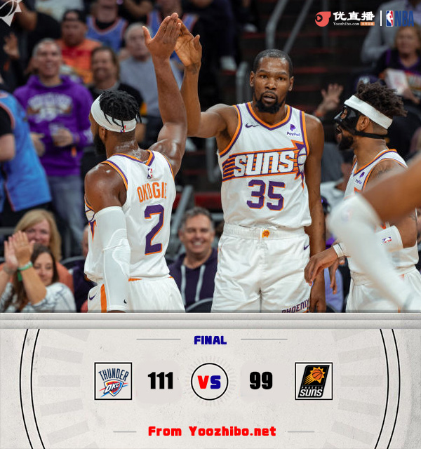 24直播网11月13日讯 NBA常规赛继续进行,太阳主场迎战雷霆,此役布克继续因小腿伤势缺阵,杜兰特和比尔率队出击,太阳上场不敌湖人,目前4胜5负暂列西部第9,雷霆上场则输给国王,5胜4负排在西部第6位。比赛开打后雷霆连续杀伤内线占据先机,比尔联手杜兰特及时回应,亚历山大和霍姆格伦内外开花,两队你来我往比分始终紧咬,首节结束时双方战成29平,次节回来,两队继续陷入鏖战,杰伦-威廉姆斯突然发力单节贡献10分,但末段太阳多点开花强势回应,半场战罢,太阳暂时领先5分。易边再战后雷霆延续火力连中三分,杜兰特连投带罚不断打进,太阳稳扎稳打保持优势,三节结束后太阳依然领先6分,末节上来,太阳进攻突然停滞,亚历山大联手霍姆格伦率队追分,末段太阳进攻依然哑火,雷霆一波12-0拉开比分,太阳追分乏力逆转无望,提前换下主力投子认负,最终雷霆111-99力克对手。