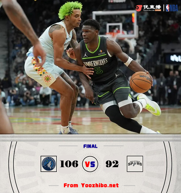 24直播网讯北京时间12月16日讯 NBA常规赛激战正酣,马刺主场迎战森林狼,文班和爱德华兹两位新星率队出击,森林狼目前13胜11负排在西部第7,马刺迎来连胜后战绩来到13胜12负,仅落后森林狼半个胜场位列西部第11位。首节争夺马刺稍显慢热,爱德华兹里突外投率先发力,率领森林狼早早确立优势,文班联手索汉及时止血,但森林狼多点开花牢牢占优,首节结束时森林狼领先9分,次节回来,马刺进攻再度停滞单节仅得到18分,文班连投带罚苦苦支撑,森林狼延续火力内外开花,半场战罢,森林狼已经领先15分。易边再战后马刺找到进攻感觉,巴恩斯连中三分率队追分,三节结束后马刺将分差缩小至6分,末节决战,森林狼再度发力扩大优势,爱德华兹拉开单打连拿6分,双方分差来到20分,比赛提前失去悬念,最终森林狼106-92力克马刺。