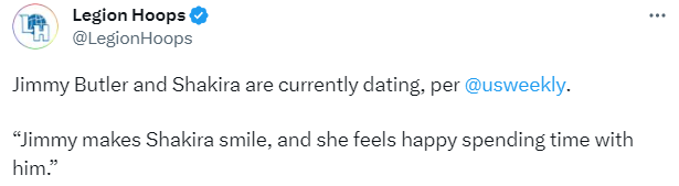 在今年总决赛期间,夏奇拉不仅通过社媒为热火加油打气,而且来到热火主场观战;之后巴特勒开始在社媒上点赞夏奇拉的动态。