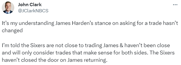 76人记者John Clark表示哈登申请离队的立场没有改变,我被告知76人还没有接近交易哈登,并且只会考虑对双方都有意义的交易,76人还没关闭哈登回归的大门。