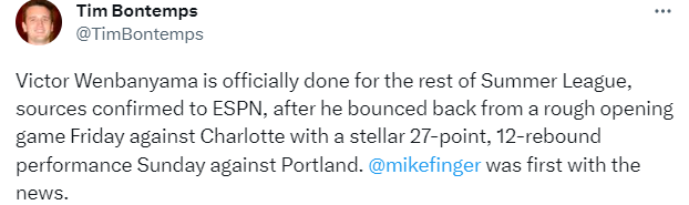 马刺记者Mike Finger报道,文班亚马的夏季联赛征程已经100%结束了;ESPN名记Tim Bontemps表示,文班亚马已经正式退出夏季联赛。