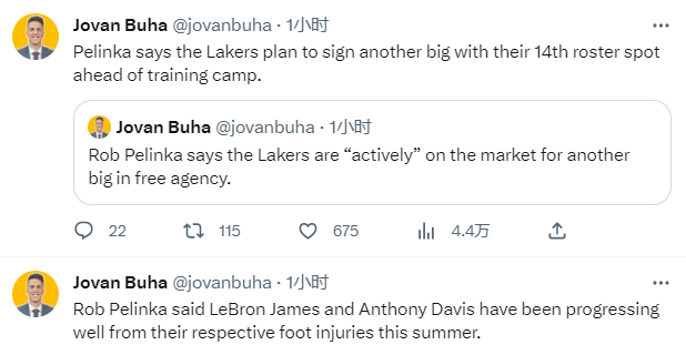 今天湖人夏联93-75大胜黄蜂,佩林卡、湖人主帅哈姆以及众新援文森特、雷迪什和普林斯都坐在场边观战;接受采访时,佩林卡表示湖人队的计划是在训练营开始前再签一名大个子球员,然后以14人名单开启新赛季。
