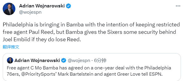 来源:24直播网07-06 13:0024直播网讯07月06日据espn名记woj报道,湖人中锋班巴已经同意和76人签下1年合同,班巴确定离开湖人,新赛季班巴辅佐恩比德冲击总冠军。