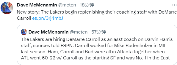 另外,据湖人记者Dave McMenamin报道,湖人已经聘请德马雷-卡罗尔作助教,加入主帅哈姆的团队。