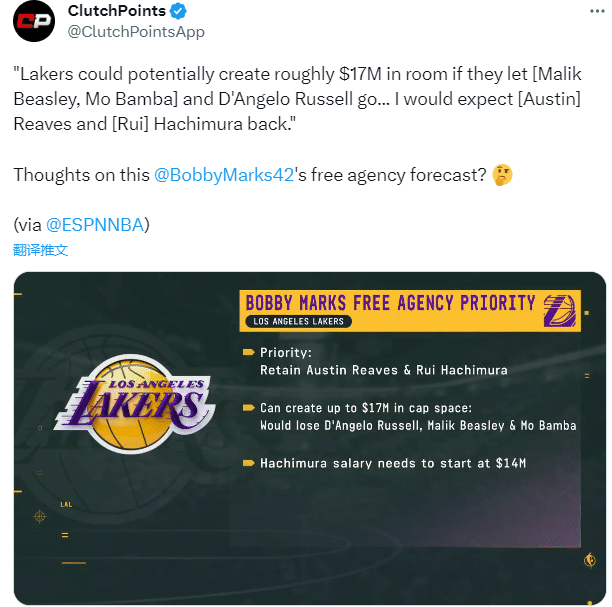 对于湖人今夏的操作,薪资专家Bobby Marks表示若湖人放弃比斯利、班巴和拉塞尔,他们可以创造1700万美元的薪资空间,预计他们将会签回里夫斯和八村垒,八村垒新合同的起薪为1400万美元。