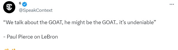 凯尔特人名宿保罗-皮尔斯在节目中表示:我们都在谈论GOAT,他可能是就是GOAT,这是不可否认的。