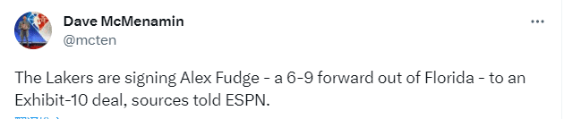 湖人队还和佛罗里达大学前锋亚历克斯-福吉签下一份Exhibit-10合同,福吉今年20岁,司职前锋,身高203cm,体重83kg;他们可以为湖人出战夏季联赛,很明显,湖人想通过夏联和季前赛来挑选适合球队的年轻人,此前他们都为湖人试训过。