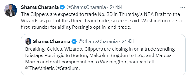 奇才送走波尔津吉斯,得到马库斯-莫里斯、阿米尔-科菲和今年首轮30号(来自快船)以及加里纳利(来自凯尔特人);凯尔特人得到波尔津吉斯,快船得到布罗格登。