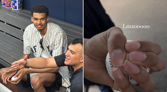 由于法甲季后赛已经结束,文班亚马无缘带队夺冠,现在他已经来到美国纽约,今天文班亚马来到洋基队主场,身穿5号并且为洋基队开球,第一球明显扔得太歪。