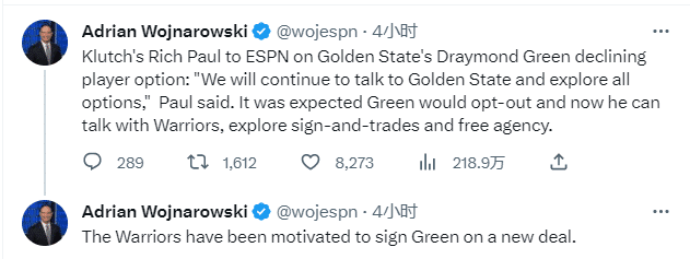 名记Woj报道,格林的经纪人里奇-保罗表示:我们将会继续与勇士对话并探索所有选择;追梦现在可以和勇士开始对话,并且会探索先签后换或者是进入自由球员市场,勇士有动力和追梦续签一份新合同。