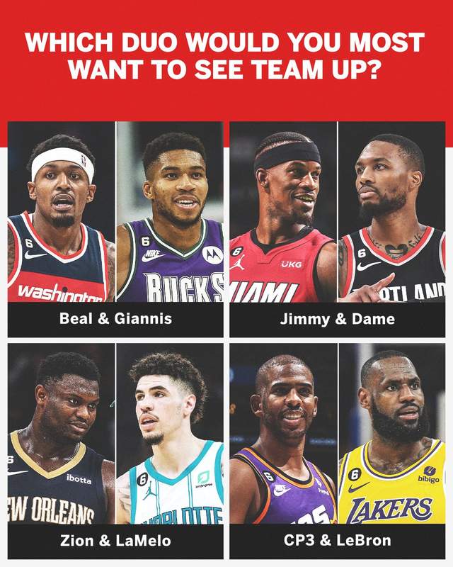 来源:24直播网06-17 12:4624直播网讯06月17日,ESPN发布了一组照片,暗示在今年夏天可能出现的4大巨星换队。他们分别是字母哥+比尔,巴特勒+利拉德,锡安+鲍尔,保罗+詹姆斯。那么这4组双巨头组合,最终是否有机会成行呢?如果最终成行,搭配效果又是如何?