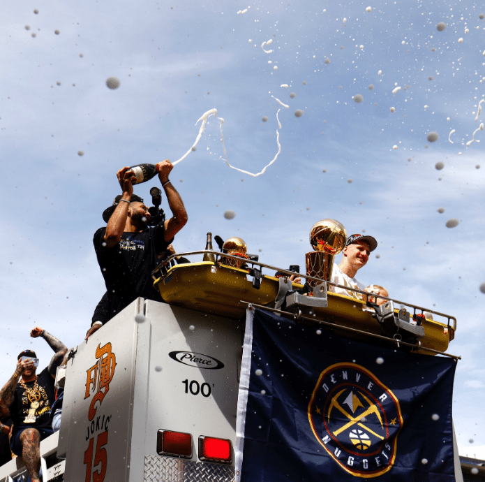 24直播网讯06月16日掘金队正式举办夺冠游行庆典,现场出现意外,约基奇妻子的面部被砸到,所幸未受伤;究竟现场有多火爆?掘金球迷挤满路两侧,马龙、穆雷狂喷香槟以及波普对瓶吹嗨翻天,小布朗、布劳恩等人赤膊亮相。
