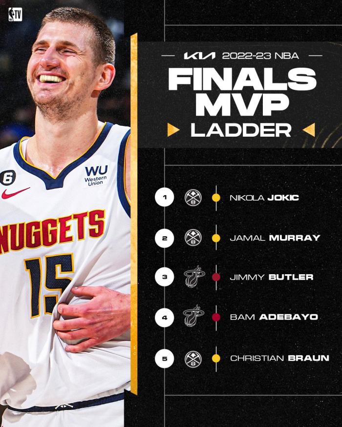 来源:24直播网06-09 10:5424直播网06月09日总决赛G3掘金大胜热火,掘金大比分2-1领先之后,NBA官方更新最新一期FMVP排名,约基奇继续位居第一,穆雷重返第二,掘金菜鸟布劳恩首次上榜。
