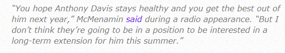 当被问及休赛期湖人是否会与浓眉签下长期续约合同时,Dave McMenamin表示:你希望安东尼-戴维斯保持健康,下赛季发挥出最好的水平,我不认为他们会有兴趣在这个夏天与他长期续约。