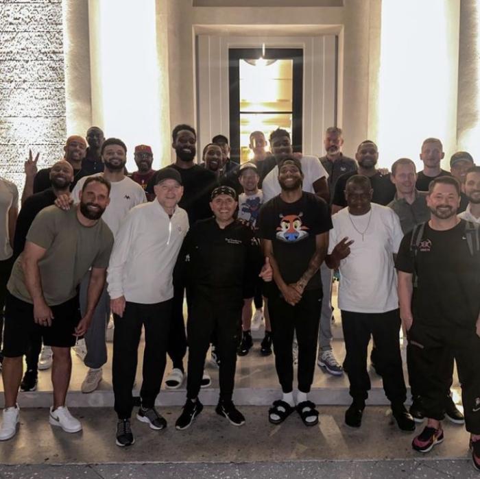 掘金全队在杰夫-格林的迈阿密家中聚餐,美媒Clutch Points晒出掘金众人合影,杰夫-格林、约基奇、小乔丹和晚餐名厨一起合影,格林还和小布朗、穆雷、主帅马龙等人合影,全队开心共进晚餐,进一步打造球队的凝聚力。