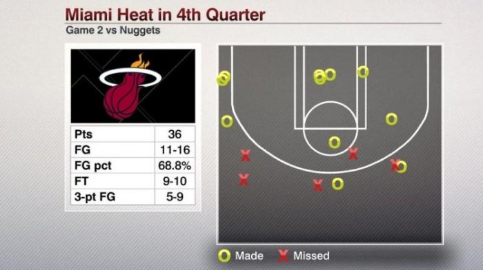 2、热火今日比赛末节合计16投11中(三分9中5),命中率高达68.8%,创近25年来总决赛末节第三高命中率
