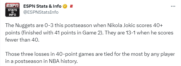 8、热火送约基奇耻辱输球,据统计,今年季后赛约基奇三场40+掘金全部输球,单次季后赛3次砍40+却输球,追平了历史纪录;而当他得分不足40分时,掘金13胜1负。
