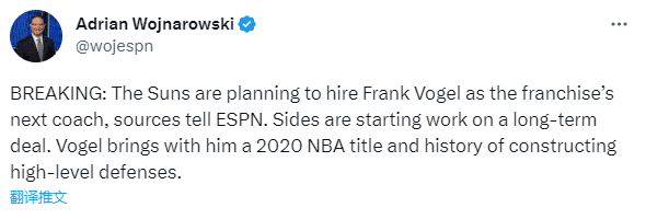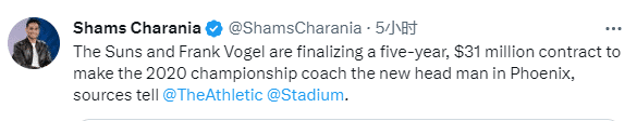 太阳给了沃格尔一份合同,这一决定是太阳老板伊什比亚、总经理詹姆斯-琼斯和其他高管共同决定的,这是一份5年3100万美元的多年合同,新赛季沃格尔将执教杜兰特和布克冲击总冠军。