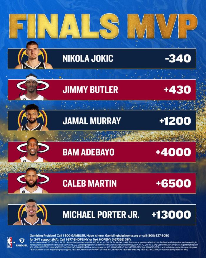 根据赛程,掘金和热火总决赛G1将在明天上午8点30分开打,你觉得哪支球队能取得总决赛开门红?西决MVP约基奇大战东决MVP巴特勒,根据最新FMVP赔率,约基奇(-340)位居榜首并且大幅度领先,巴特勒(+430)排在第二位,穆雷、阿德巴约、马丁、小波特也上榜。