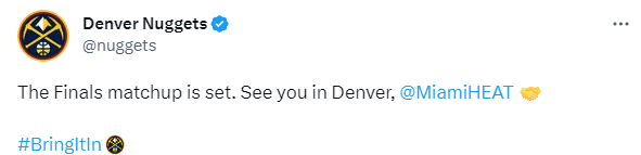掘金全队以逸待劳,他们比热火多歇了一周,直到总决赛G1开打,掘金足足获得10天的休息,掘金官方晒约基奇对位巴特勒的赛场照,并且宣战总决赛见;掘金公布今年总决赛的具体赛程,如下(均为北京时间):