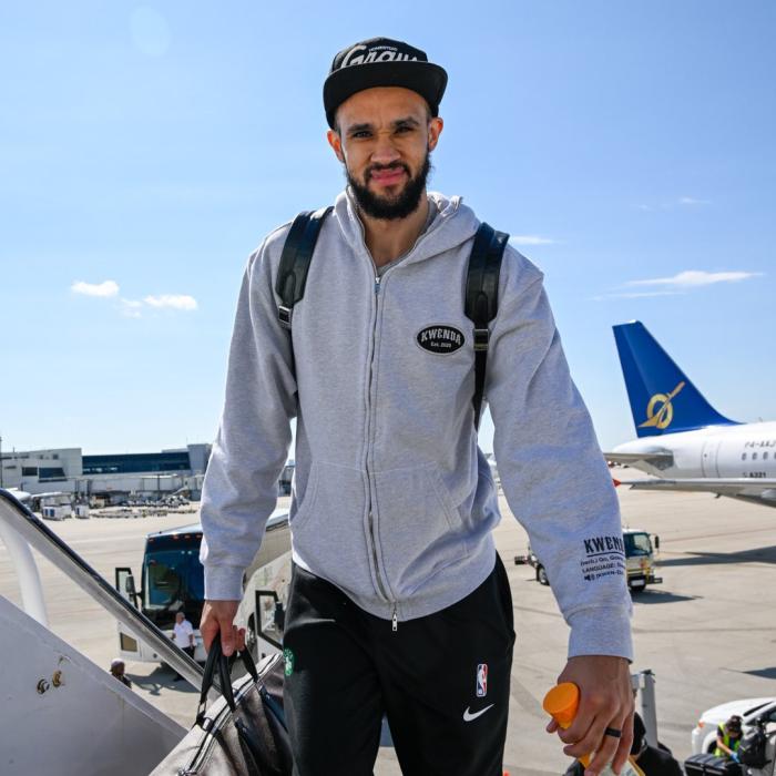 绿军众将带着胜利返回波士顿,塔图姆登机时提着行李,吹着口哨瞪大双眼,开心之情溢于言表;G6绝杀英雄怀特戴着棒球帽、背着双肩包,表情十分抢镜;杰伦-布朗戴着针织帽,帽子挡住了眼睛,一脸严肃的表情。