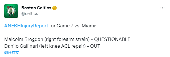 凯尔特人官宣东决G7伤病报告,布罗格登(右前臂拉伤)出战成疑,加里纳利继续休战;热火队希罗(右手骨折)、奥拉迪波(左膝伤病)继续休战,阿德巴约(右肩不适)和泽勒可以出战,文森特(左脚踝扭伤)出战成疑。