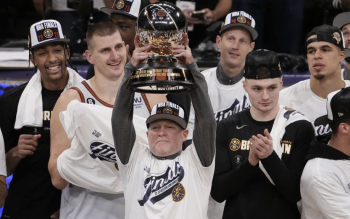 约基奇捧起西决MVP后,全队都为他高呼MVP以及按着约基奇的头疯狂庆祝;离场时,约基奇抱着MVP奖杯和两个哥哥拥抱庆祝,马龙离场时,约基奇的两个哥哥直接抱起掘金主帅。