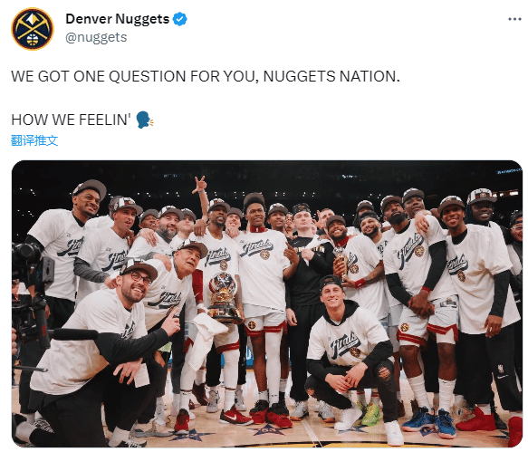 掘金夺得西部冠军后,全队合影留念,湖人旧将波普站在C位双手抱着西部冠军奖杯,小布朗则抱着约基奇的MVP奖杯,约基奇低调站在后面,仅仅露出一个头;穆雷靠在小布朗的肩膀上;掘金全队都戴着西部冠军帽,众人都一脸笑容十分开心。
