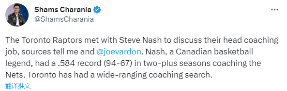 据The Athletic名记Shams报道,猛龙和加拿大篮球界传奇人物纳什会面,商讨执教事宜,纳什曾担任篮网主教练,常规赛执教战绩是94胜67负,季后赛则为7胜13负。