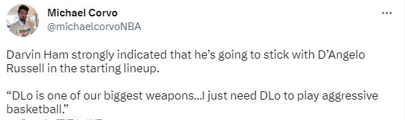 哈姆拒绝让拉塞尔替补,强烈表态会坚持让拉塞尔首发,他表示:归根结底,他是我们最重要的武器之一。没有他,我们就无法达到现在的位置。我已经向他强调要保持积极的态度,我希望他能够打出侵略性。