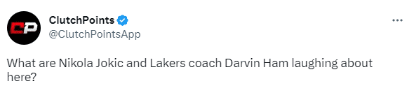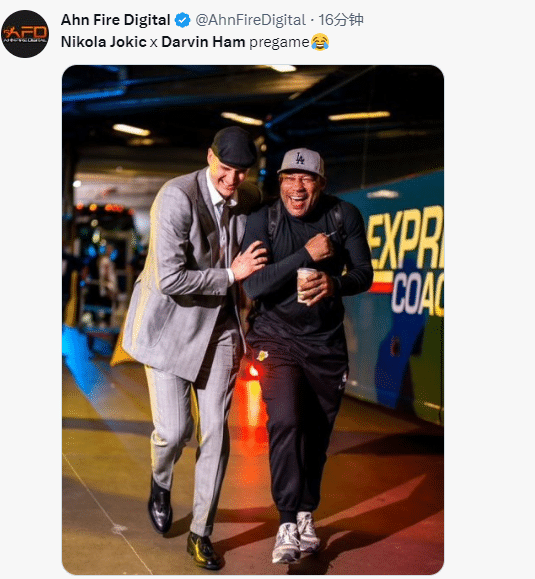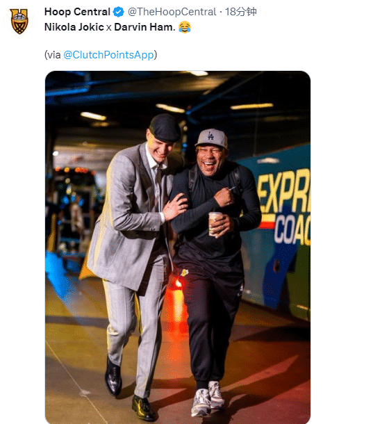 西决G2赛前,约基奇穿着西装、皮鞋抵达球馆,佩戴一顶小帽亮相,在球员通道中,约基奇搂着湖人主帅哈姆大笑入场,两人都咧嘴大笑;哈姆带着印有LA的棒球帽,背着双肩包并且拿着饮料,两人如此亲密一幕引热议,众美媒疯狂转发这一幕。
