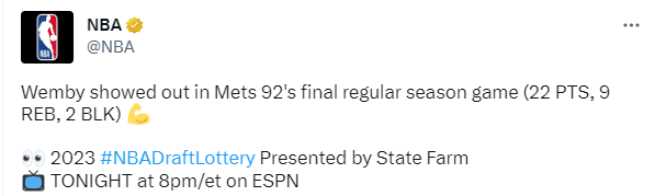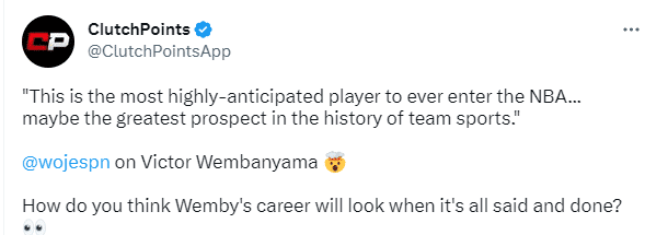 在NBA选秀乐透抽签日,文班亚马冲上推特热搜榜第二名引热议,名记woj在节目中表示,文班亚马是有史以来进入NBA后最受期待的球员,也可能是团队运动史上最有前途的一次。