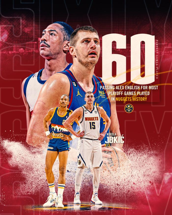 3、约基奇生涯出战的第60场季后赛比赛,超名宿英格利什(59场),升至掘金队史第一