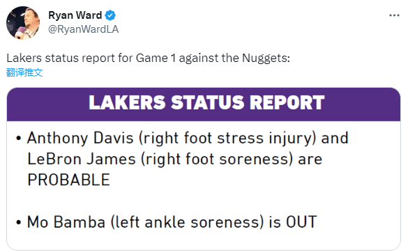 湖人官宣西决G1伤情:詹姆斯浓眉大概率出战 班巴因伤暂时离队