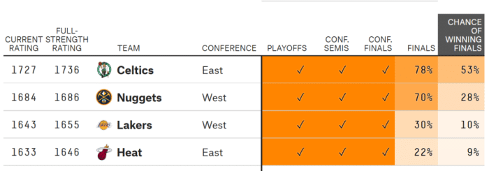 排在第二的是掘金,他们被看好有28%的概率夺冠。约基奇季后赛状态神勇,穆雷和波特的健康回归帮他减轻了不少负担。相比之下,湖人和热火就被看衰了。毕竟,一支是黑八,一支是黑七,他们依然是不被看好的一方,即便已经走到这里。