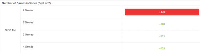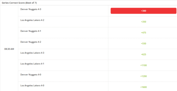 具体赔率排名如下:1.掘金4-3(+300)、2.湖人4-2(+350)、3.掘金4-1(+475)、4.掘金4-2(+550)、5.湖人4-3(+625)、6.湖人4-1(+1100)、7.掘金4-0(+1200)、8.湖人4-0(+1600)。