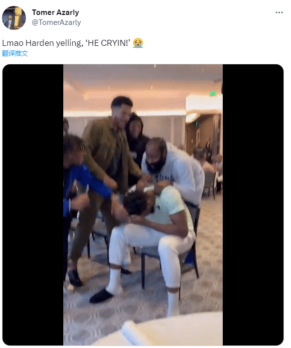 76人全队坐着等待联盟公布MVP得主,恩比德确定当选后,全队为他欢呼以及集体呐喊MVP,恩比德激动落泪,哈登直接冲过去熊抱恩比德,并且高呼:他哭了,他哭了。
