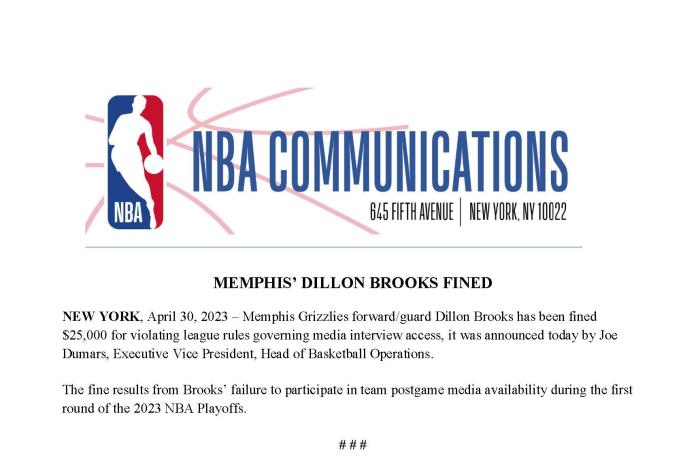NBA官方宣布,灰熊队球员狄龙-布鲁克斯因拒绝接受赛后采访被罚款25000美元;在首轮系列赛中,狄龙多次用一句“我退出。(I’m out)”拒绝接受赛后采访,违反了联盟的相关规定。