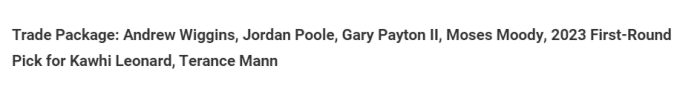 具体方案是勇士送出维金斯、普尔、佩顿二世、穆迪和2023年首轮签,得到快船的莱昂纳德和曼恩。美媒认为这笔交易能让勇士再次成为联盟最好的球队,库里、汤普森、追梦再加上小卡,可以兼顾攻防,当然那也意味着一次冒险,他们得希望小卡能保持健康,充分利用库里的巅峰期,再冲击几座总冠军。至于快船就能完成快速重建,维金斯、普尔能带来即战力,佩顿的防守很好,穆迪和2023年首轮代表着未来。