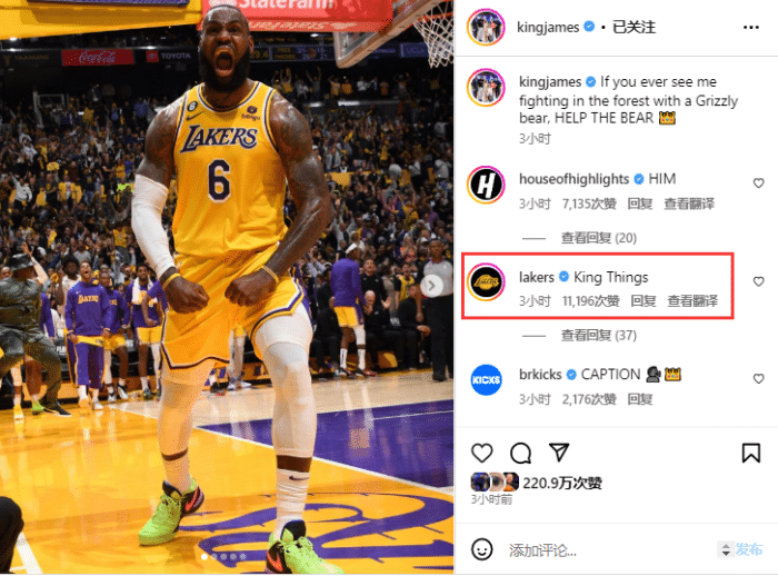 短短3个多小时,詹姆斯的动态获得超过220万点赞,湖人官方在评论区写道:国王做了所有事情。