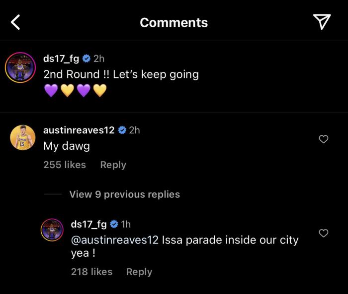 施罗德更新动态写道:第二轮,让我们继续加油;里夫斯回复:我的兄弟;施罗德则说在我们的城市里游行。