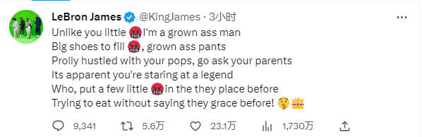 詹姆斯还引用歌词发推写道:不像你们小孩,我是一个成年人。我们都是成年人作派。我可能和你们的父母拼搏过,回去问你爸妈吧。很明显你在盯着一位传奇——他刚刚教育了几个小孩,他们在做祷告前就想吃饭!